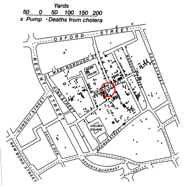 One of the classic examples of the use of “place” in a public health investigation is John Snow’s mapping of cholera cases in London. John Snow was a physician who was in London during a huge outbreak of cholera. He went from house to house, asking for the characteristics of people in the household who were ill. When he plotted the number and location of those who were ill, he came to the conclusion that one water pump was causing the great majority of cases. He removed the pump handle from the pump in question, and the number of cholera cases dropped precipitously.