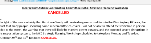 Last week there was supposed to be a 2 day workshop of the the U.S. Interagency Autism Coordinating Committee (IACC) to update the Strategic Plan. The workshop was to be held in Washington DC. The meeting was cancelled due to Hurricane Sandy.