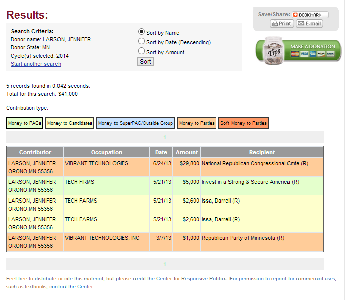 The donations were reported to have been made from Jennifer Larson, who is with the tiny “Canary Party”. Tax documents indicate that Ms. Larson is a large financial backer of the Canary Party. Searching for what donations Ms. Larson has made (using OpenSecrets.org, the Center for Responsive Politics) I found a total of $40,000 donations to Congressman Issa, his PAC and the Republican National Committee though Ms. Larson and her company Vibrant Technologies (click to enlarge):