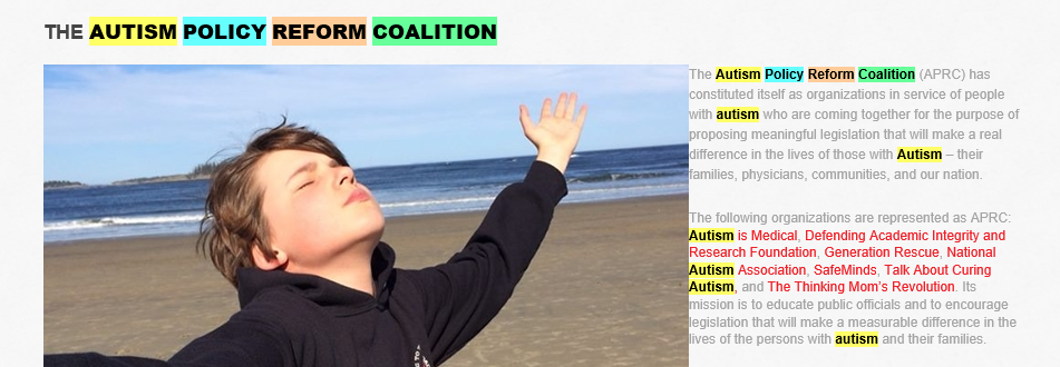 There’s a group working to change the law reauthorizing Federal autism research. They haven’t been very successful so far and, frankly, that’s OK with me. That group, or coalition, calls itself the Autism Policy Reform Coalition. The coalition’s member groups are small and focused on the idea that vaccines cause autism.