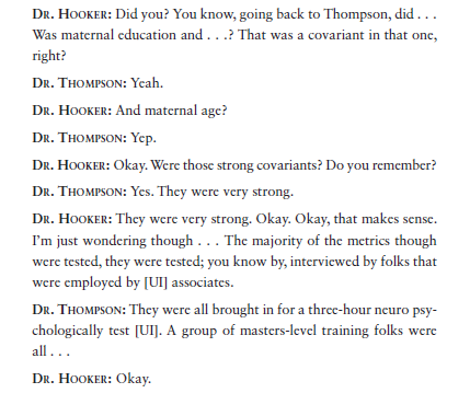 OK, he knows that a “simple” approach is not considered strong. This begs the question: how important are socioeconomic factors and maternal education he’s worried about? I could tell you that they are huge factors for the conclusion he’s trying to make. But don’t take my word for it, because Hooker and Thompson did discuss the importance of maternal education in the recorded calls. And this discussion is very telling. Consider this exchange: