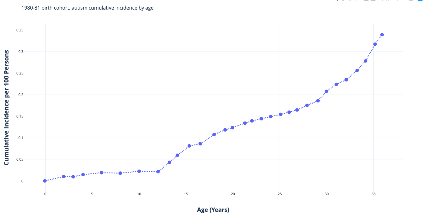 Let’s take a few examples. Again, for that bottom line (people born in 1980-81). At age 10, the autism prevalence is about 0.02%. So, if you had asked in 1990 (when these autistics were 10), “what’s the autism prevalence for 10 year olds in Denmark”, you’d have been told 0.02%. 2 in 10,000. And if you never looked again, that’s what you’d think the autism prevalence is for people born in 1980. Which is exactly why you hear, “the autism prevalence back in the day was 1 in 10,000.” No one looked again.