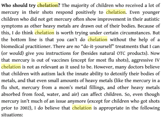 Yeah–I remember when chelation was sort of big. Parents were advised to *not* go to medical toxicologists. Because, you know, the tests they give aren’t accurate (since all kids are mercury poisoned, tests that say no are obviously wrong). Instead one was supposed to do hair testing. And not look for the heavy metals, but look instead for other elements and count them. Funny thing was that pretty much any result meant “you need to chelate”.