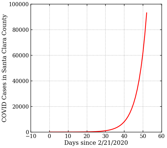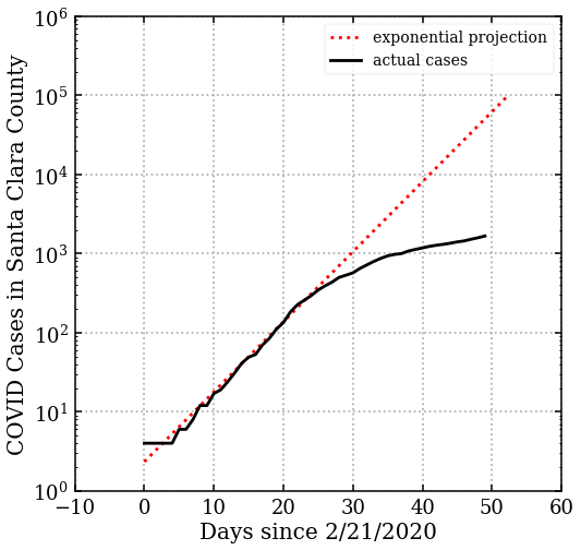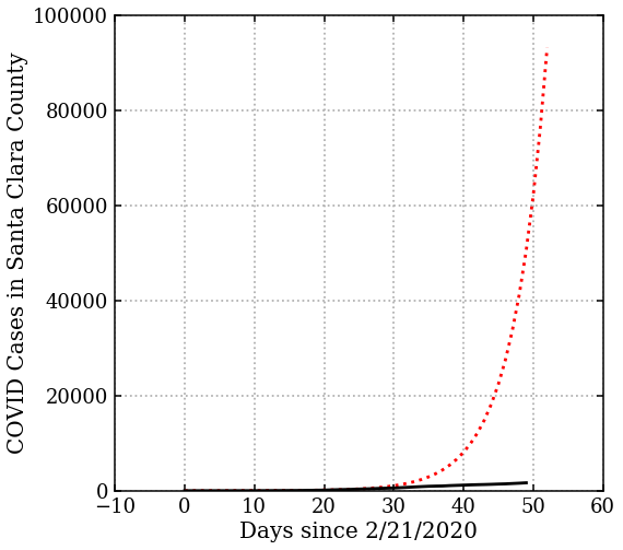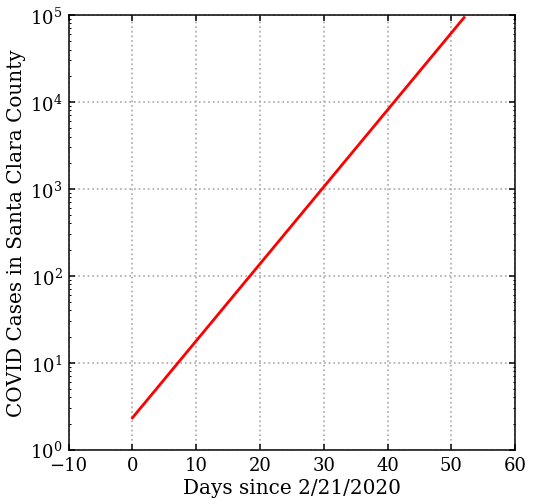 Put yourself in a public health official’s place. You see these data, what does that tell you about the future? Well, since it’s an exponential, we can use the fit to predict. Consider 4 weeks out from the date of shelter in place. Ask, how much would the epidemic have grown in that time? The curve tells us: we would have grown to about 93,000 identified cases (assuming testing could keep up).