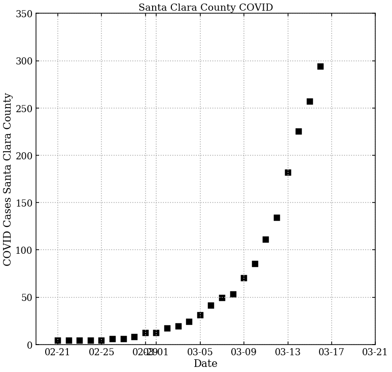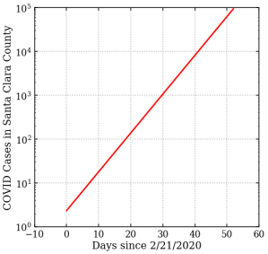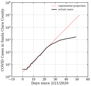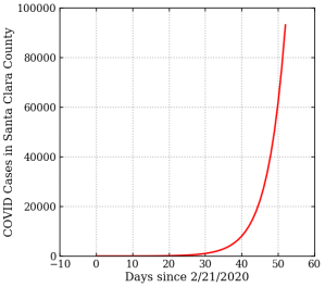 I live in Santa Clara County, which was one of the first counties to institute shelter-in-place (SIP) on March 17, 2020. While I was surprised by the order, the reasoning was already becoming clear: the virus was spreading in our county at an alarming rate. I had been watching the numbers day by day, and we were seeing a case count doubling every 5 days. New York City was clearly seeing the start a huge outbreak at this time.. In a little over a month previous Italy had seen deaths rise from near zero to 6,000 per day. That’s one month.