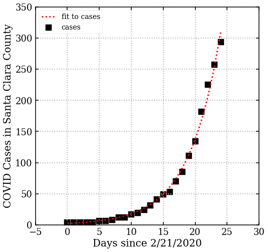 Looks like an exponential, and this is exactly what it is. Cases were growing fast. Here’s a fit to those data using an exponential growth curve:
