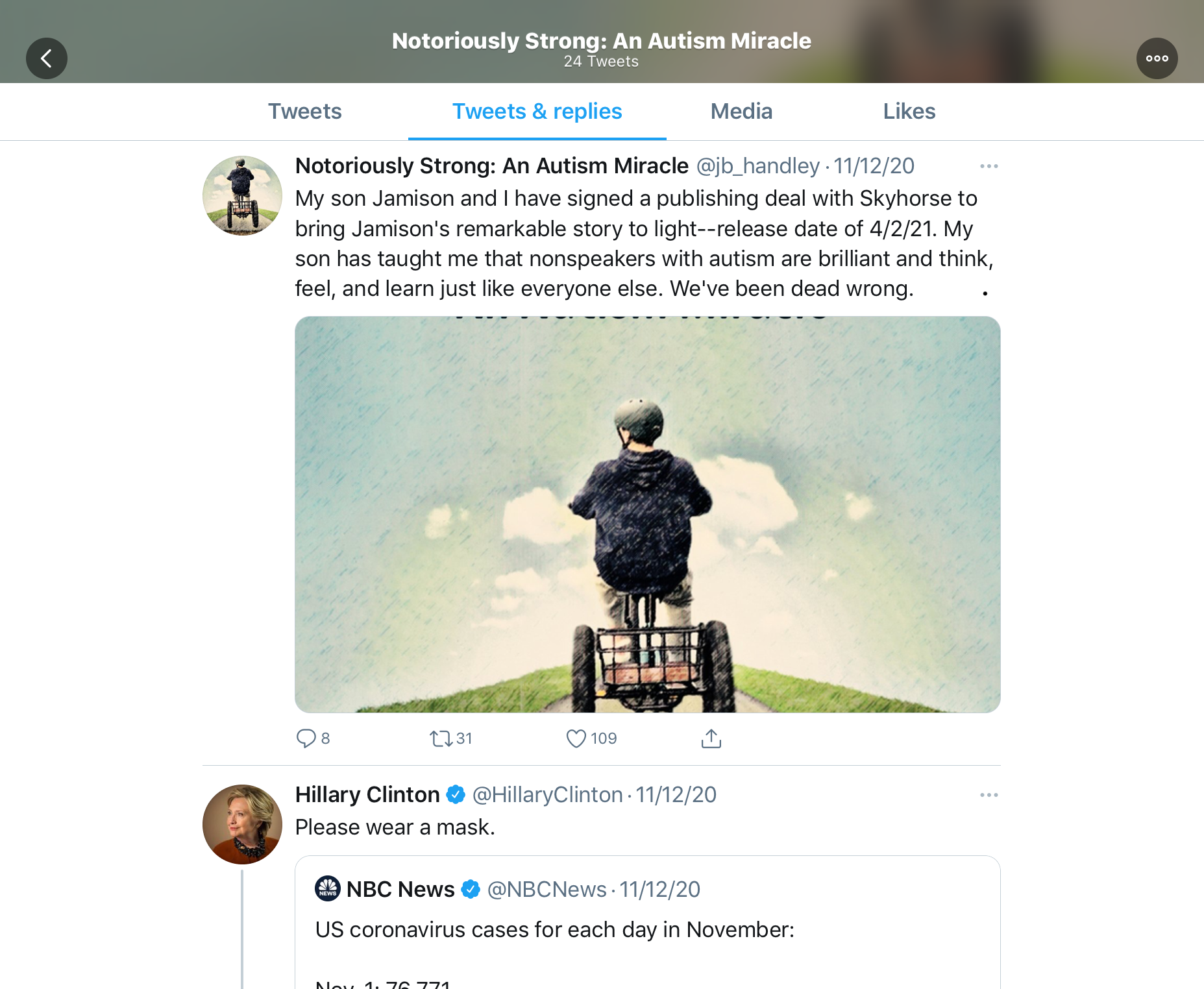 Which brings us to the image above. Mr. Handley is writing a book with his son. His son has taught him that nonverbal autistics can be brilliant, and they can think, feel and learn like everyone else. And “we’ve” been dead wrong.