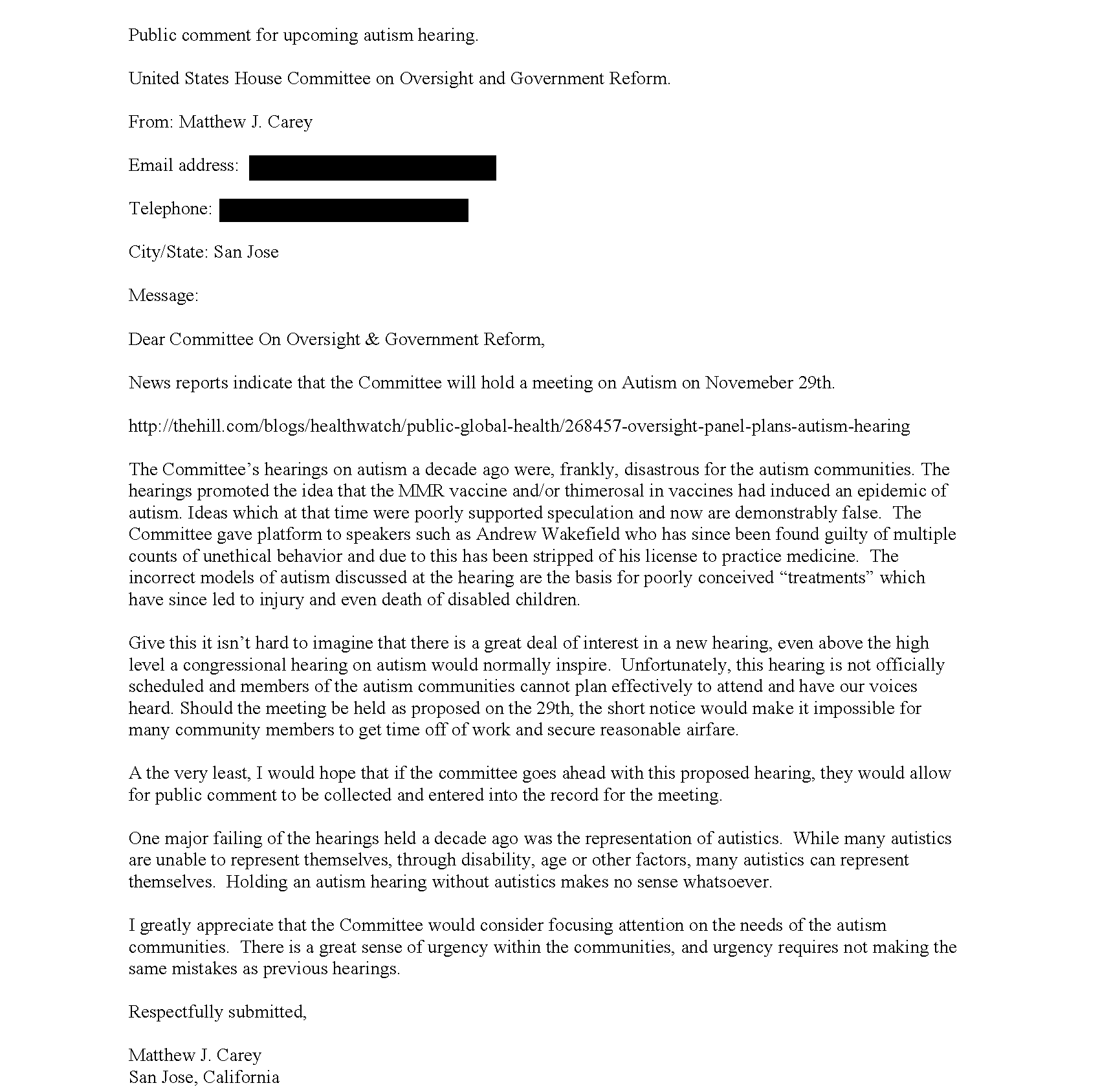 I write to you in regards to your upcoming autism hearing. Much has happened in the decade since the Committee last met on autism.