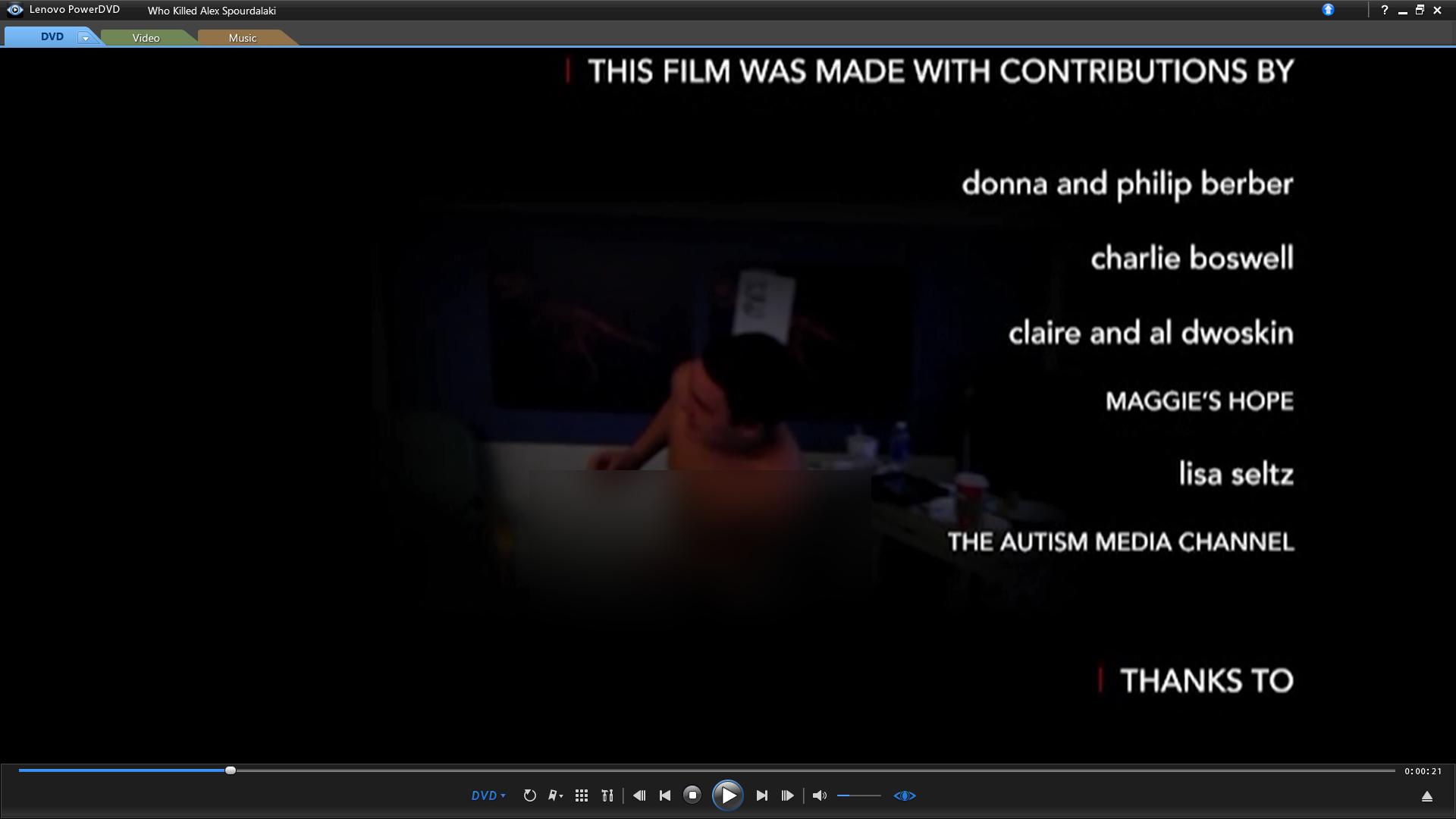 In the credits we get snippets of video of Alex. Starting with Alex near the end of his life, naked and rocking. While Alex does appear to be happy in these clips, showing him naked without his permission is inappropriate (note that while Mr. Wakefield does not show Alex’s full body, I have further blurred this image). Then, after showing Alex as a baby and flowers for Alex (complete with business card for Wakefield’s Autism Media Channel), the credits end.