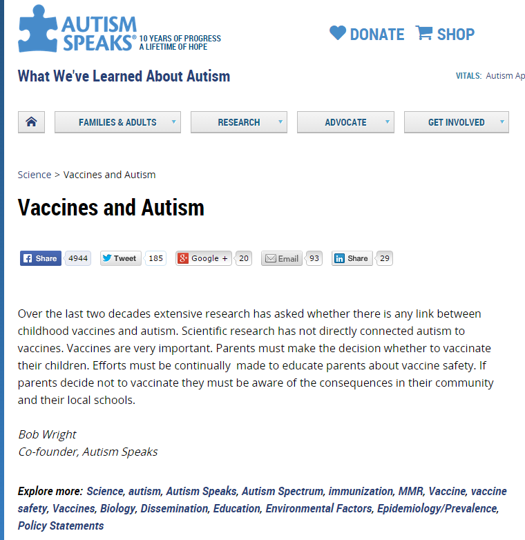 Because why should we let the Chief Science Officer have the actual word on what Autism Speaks thinks about an issue of science?  Why let a clear statement stand alone when one can leave the door open with “Scientific research has not directly connected autism to vaccines.”