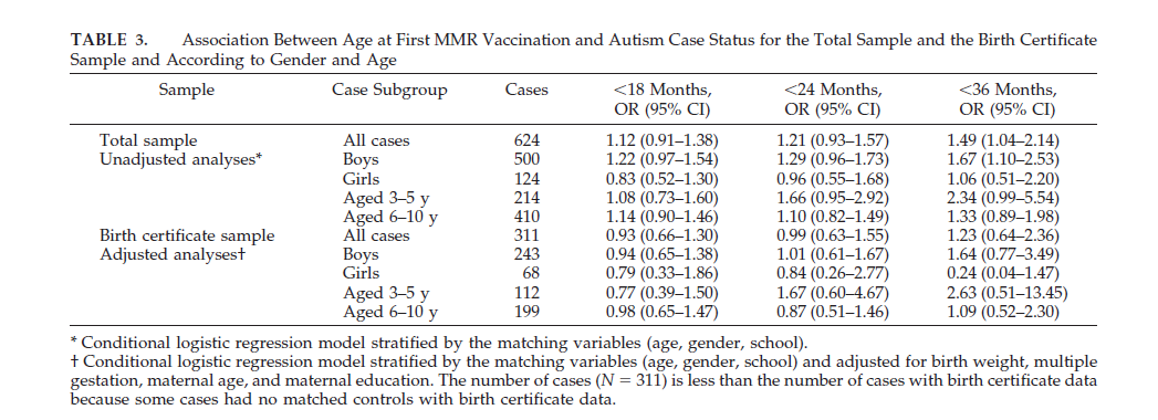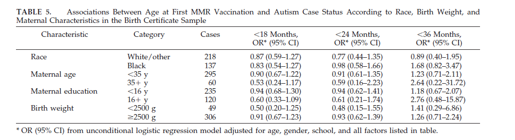 If you look at Table 5 (click to enlarge) you see an interesting and very strange trend. It was in the other data but it’s really clear here. The odds ratio is much larger for kids who got MMR before 36 months than for kids who got it before 24 months. The odds ratios still encompass 1, but there is something going on in the data for the kids who got vaccines between 24 and 36 months. And by “something going on” we always have to consider social factors. But take a look: