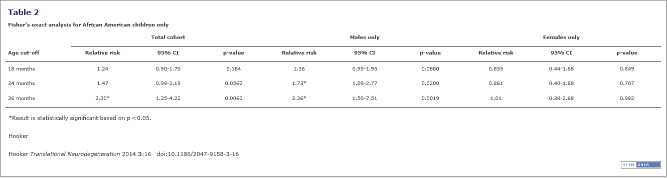 He states a relative risk that is statistically significant for African American boys who get the vaccine before 24 months (RR=1.73) and before 36 months (RR=3.36). No increased risk for African American girls. And, as Table 3 shows, no increased risk for non African Americans.