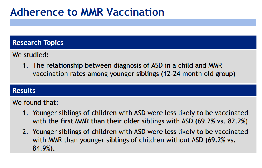 In addtion, an unpublished study from 2011 compared vaccination status among ASD kids, their siblings and non-relatives. The authors found: