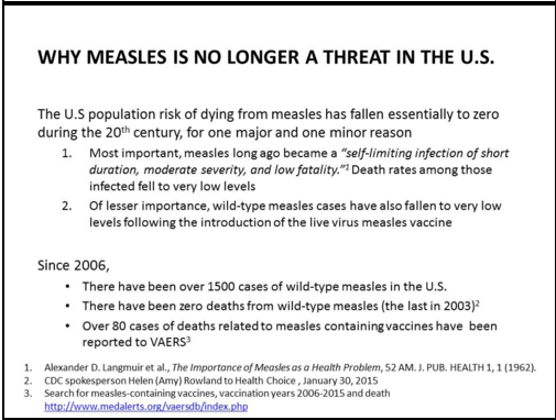 His recent article on AoA is “Measles Hysteria — The Truth About a Non-Epidemic in Eight Simple Slides”. It’s junk and one could spend an article debunking each point. But Let’s take a more focused look. He has a slide “Why Measles is No Longer a Threat in the U.S.” (click to enlarge)