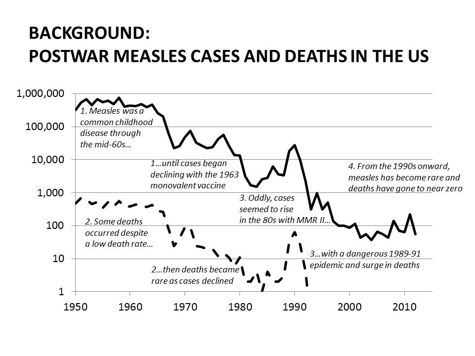 Here’s the thing that pops out of that graph: the death rate has remained constant at about 1 in 1,000 since at least 1950. Take a look at any datapoint in the deaths and go up a factor of 1,000 and there’s the infection rate. And that doesn’t account for SSPE deaths years later.