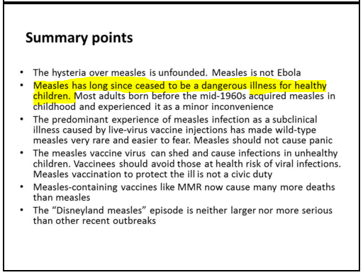 Measles has ceased to be a dangerous illness? Seriously? First, the idea that we can accept 1 out of 1000 people dying due to measles is just astonishingly bad advocacy. For that point alone we in the autism community need to distance ourselves from Mr. Blaxill and people like him. These irresponsible actions are not the actions of the autism community.