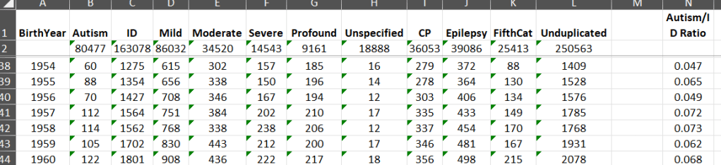 *Here’s a screenshot of the spreadsheet I got from CDDS. It is from 2015. I added a column with the ratio of consumers in the autism category to the ID category. For people born around the same time as Mr. Kennedy, the age group likely represented at Wassaic when he was there, it’s about 1:20. I.e. for every 20 people at Wassaic with ID, there was at least one autistic individual. All this without saying “they weren’t diagnosed”.