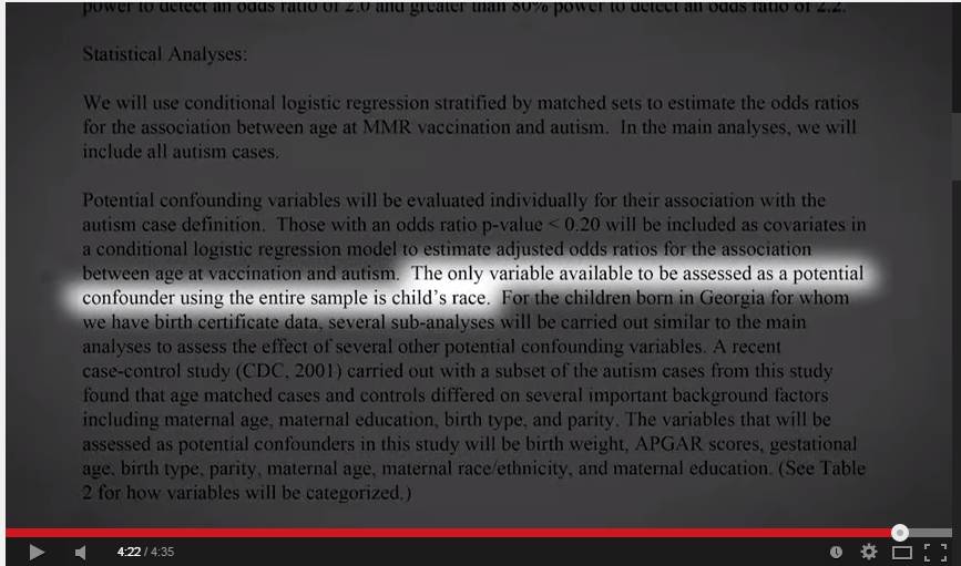 In a recent video, Mr. Wakefield shows us the research plan the CDC had drafted.  One red flag with Mr. Wakefield’s approach so far has been how he tries to tightly manage the flow of information.  He has not shared the analysis plan in total and only now has he provided us with a couple screenshots.  Begs the question: what are they hiding?