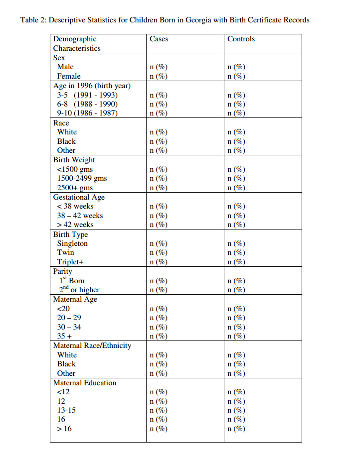 Potential confounding variables will be evaluated individually for their association with the autism case definition. Those with an odds ratio p-value < 0.20 will be included as covariates in a conditional logistic regression model to estimate adjusted odds ratios for the association between age at vaccination and autism. The only variable available to be assessed as a potential confounder using the entire sample is child’s race. For the children born in Georgia for whom we have birth certificate data, several sub-analyses will be carried out similar to the main analyses to assess the effect of several other potential confounding variables. A recent case control study (CDC, 2001) carried out with a subset of the autism cases from this study found that age matched cases and controls differed on several important background factors including maternal age, maternal education, birth type, and parity. The variables that will be assessed as potential confounders in this study will be birth weight, APGAR scores, gestational age, birth type, parity, maternal age, maternal race/ethnicity, and maternal education. (See Table 2 for how variables will be categorized.)
